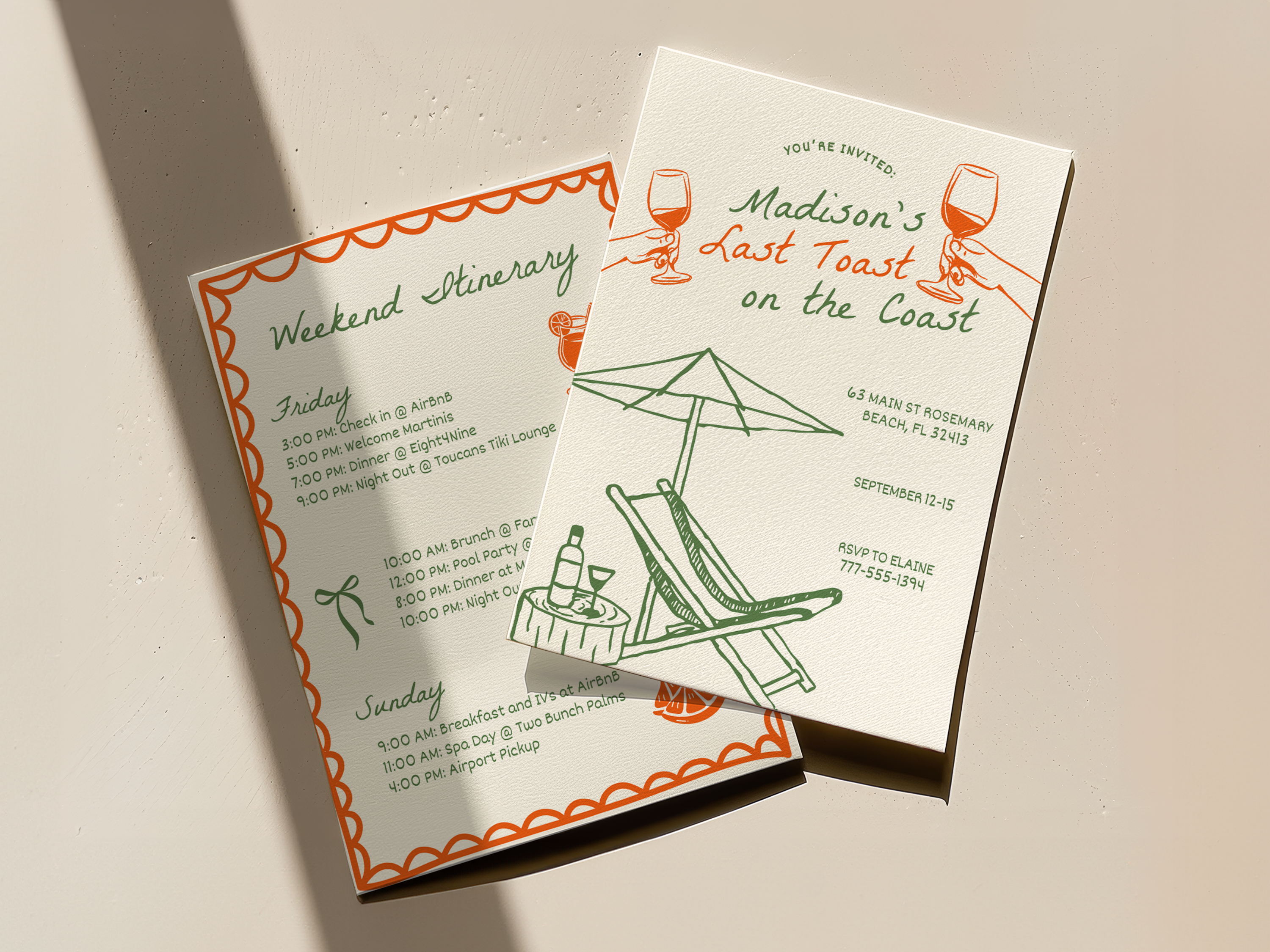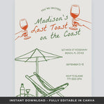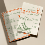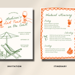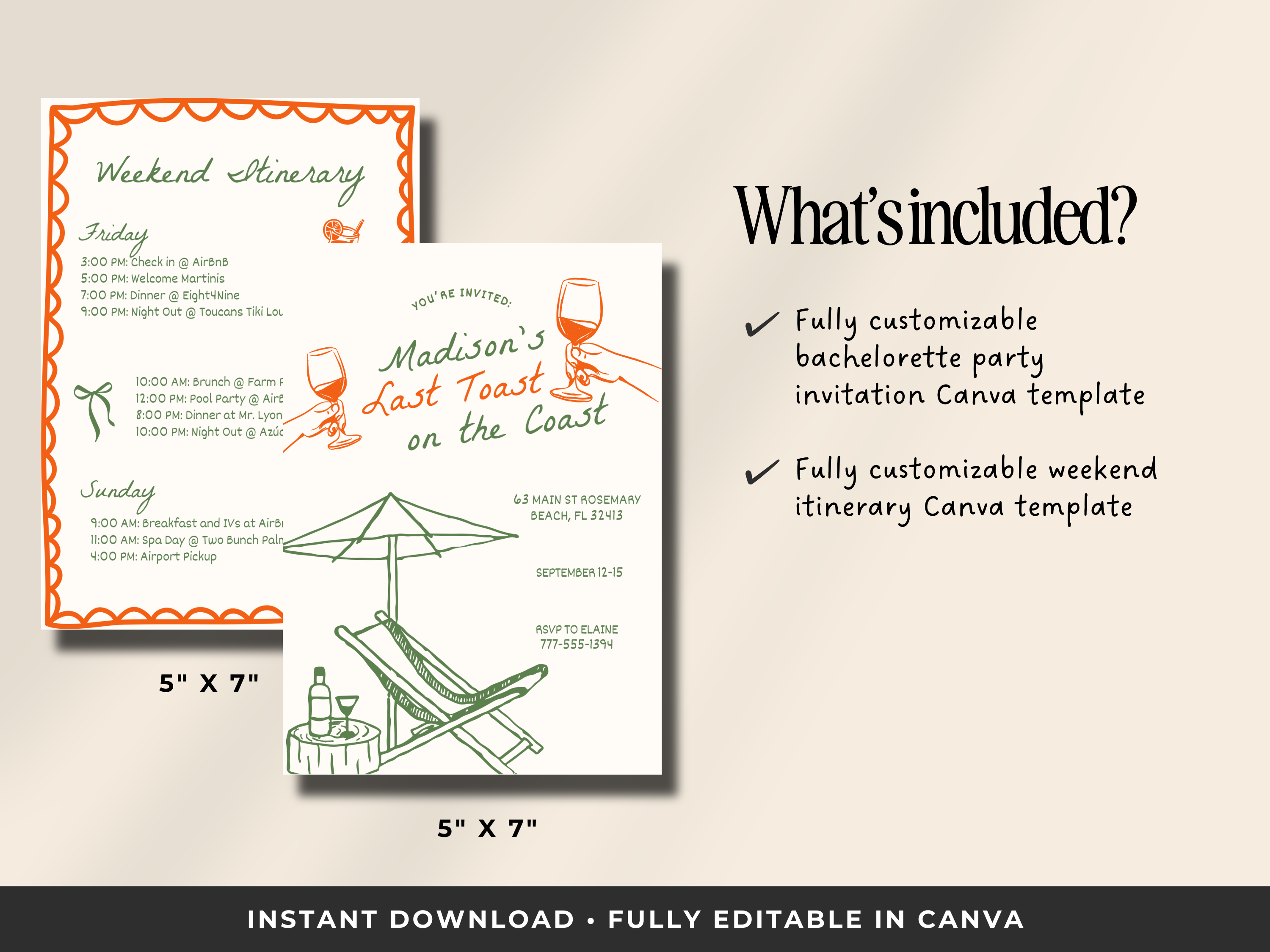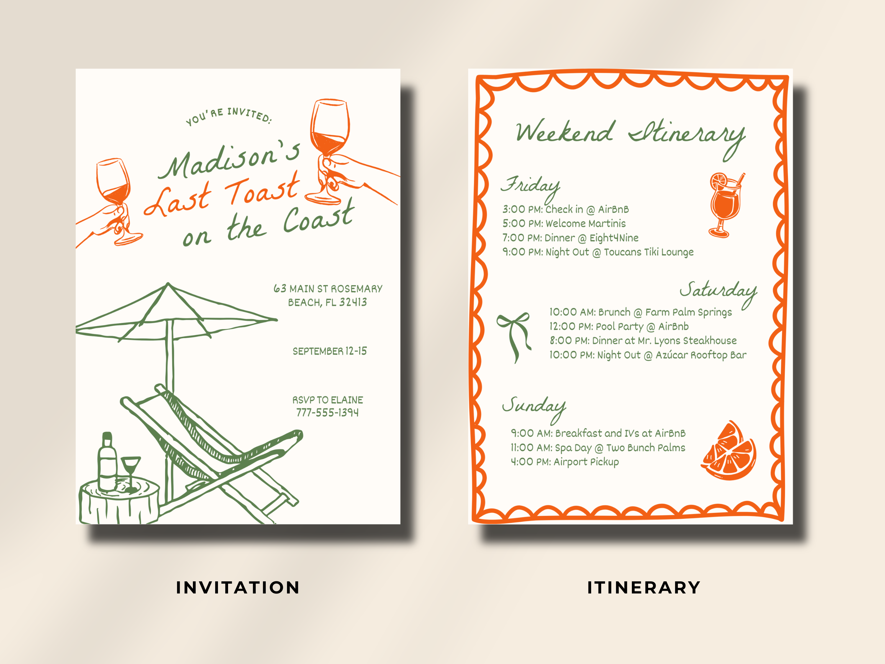 Set the tone for the bachelorette weekend of your dreams with our hand-drawn style "Last Spritz" bachelorette invitation and itinerary template. With the charm of a handwritten invite and the ease of a simple digital template, this unique and vintage-feeling design gives you the best of both worlds. Grab your instant download now and have it ready to send in just minutes!