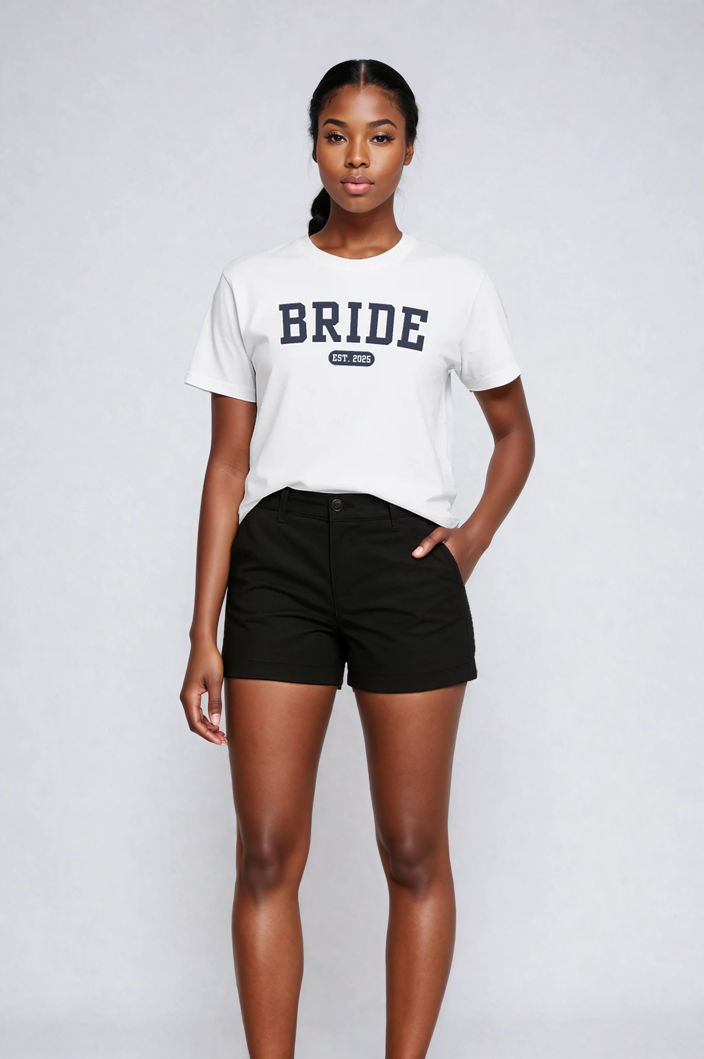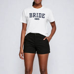 - Screen Printed Varsity Lettering: “Bride” printed in varsity letters across the chest.