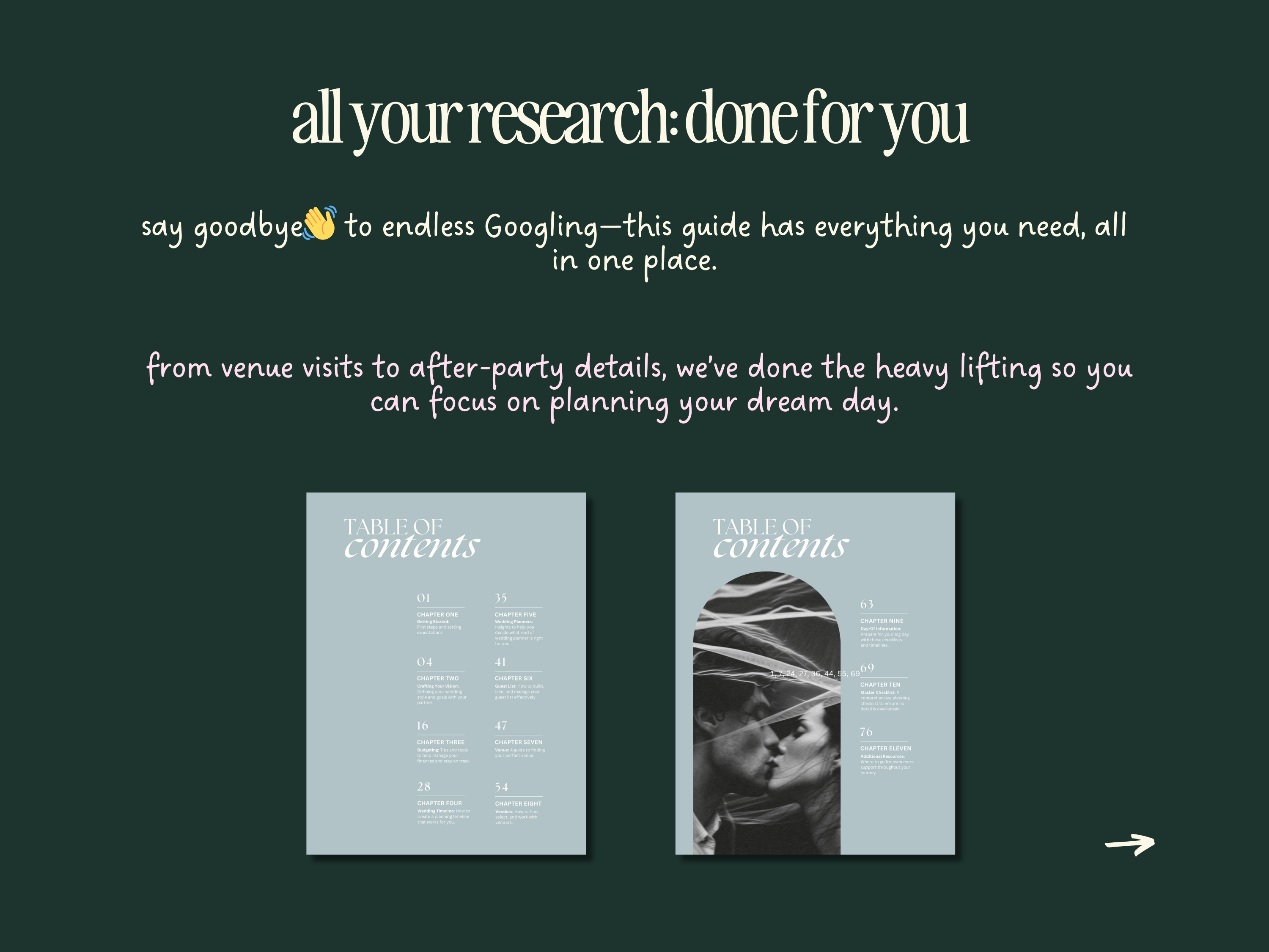This beautifully crafted digital guide walks you step by step through every part of wedding planning - from defining your vision to setting a budget, choosing vendors, and creating a seamless timeline. Whether you're just engaged or in the final stretch, this book ensures you stay organized and stress-free.